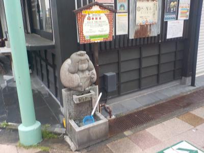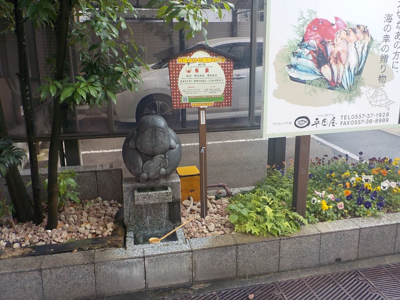 お湯かけ七福神は伊東駅から徒歩数分の湯の花通りにあります。もらった地図にはスタンプラリーできるようになっています。七つある七福神の中では、伊東駅から最も遠い位置で湯の花通りの最も南側にあります。温泉が休止中の七福神があったのですが、布袋尊はしっかりと温泉が出ていました。柄杓で温泉を布袋尊にかけてからお参りしました。布袋尊はかわいらしいものでした。縁談、商談成就、愛敬蓄財のご利益があるそうです。