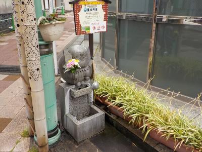 伊東駅からほど近い湯の花通りには、お湯かけ七福神があります。付近のお店では地図を兼ねたスタンプラリーの用紙を配っています。これを持って商店街の七福神を探すのも楽しいです。毘沙門天は戦いの神だからもっと精悍な感じのものと思っていましたが、かわいい感じに仕上がっていました。花まで持っているのでイメージとはずいぶん違っていました。ただ訪れた日は「温泉が休止中」と書かれていたので、お湯かけはできず残念でした。