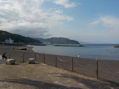 JR伊東駅から徒歩5分くらいですし、伊東温泉の宿泊施設から遠くないので使いやすいビーチと思います。まだ海水浴のシーズンではないので、海岸を散歩する方に出会っただけです。海岸沿いにある遊歩道にはヤシの木が植えられて、雰囲気があるビーチでした。砂浜に下りてみましたが、波は穏やかでした。シーズンになると海の家が並ぶそうです。海水浴を目的に来る人も、宿泊者は宿から近いし、日帰りでも近くにある道の駅の日帰り温泉に入ればサッパリして帰宅できると思います。