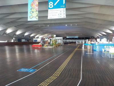 国内外の大型客船が入港する客船ターミナルです。3万トンクラスまでの客船なら同時に4隻、有名な「飛鳥」などの大型船なら同時に2席が着岸できます。海風に吹かれながら軽い上りのウッドデッキをゆっくり上って行くと、屋上広場は天然芝も張ってあります。船の甲板をイメージしたウッドデッキは歩くのに優しい感触があります。先端には休憩用のベンチがあるのでゆっくりと横浜港全体の景色を見ることができます。帰りには屋内通路を利用しました。1階にはかなり広いホールがあったり、出入国管理事務所のようなものがありました。