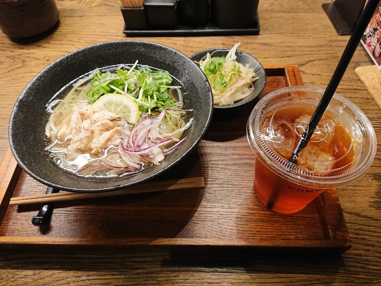 テーブル席とカウンター席があり、テーブル席ではつまみと一緒に飲んだりする事もできるみたいですが、お手軽なフォーと飲み物のセットもありました。