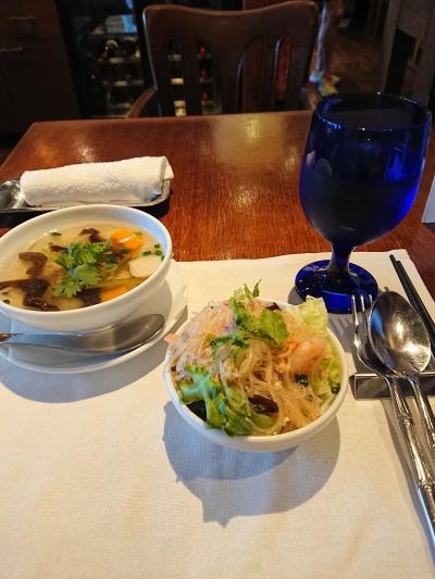 前菜の春雨サラダもピリ辛で美味しく、セットのスープもアッサリとしているけど、結構具沢山で食べごたえがあります。