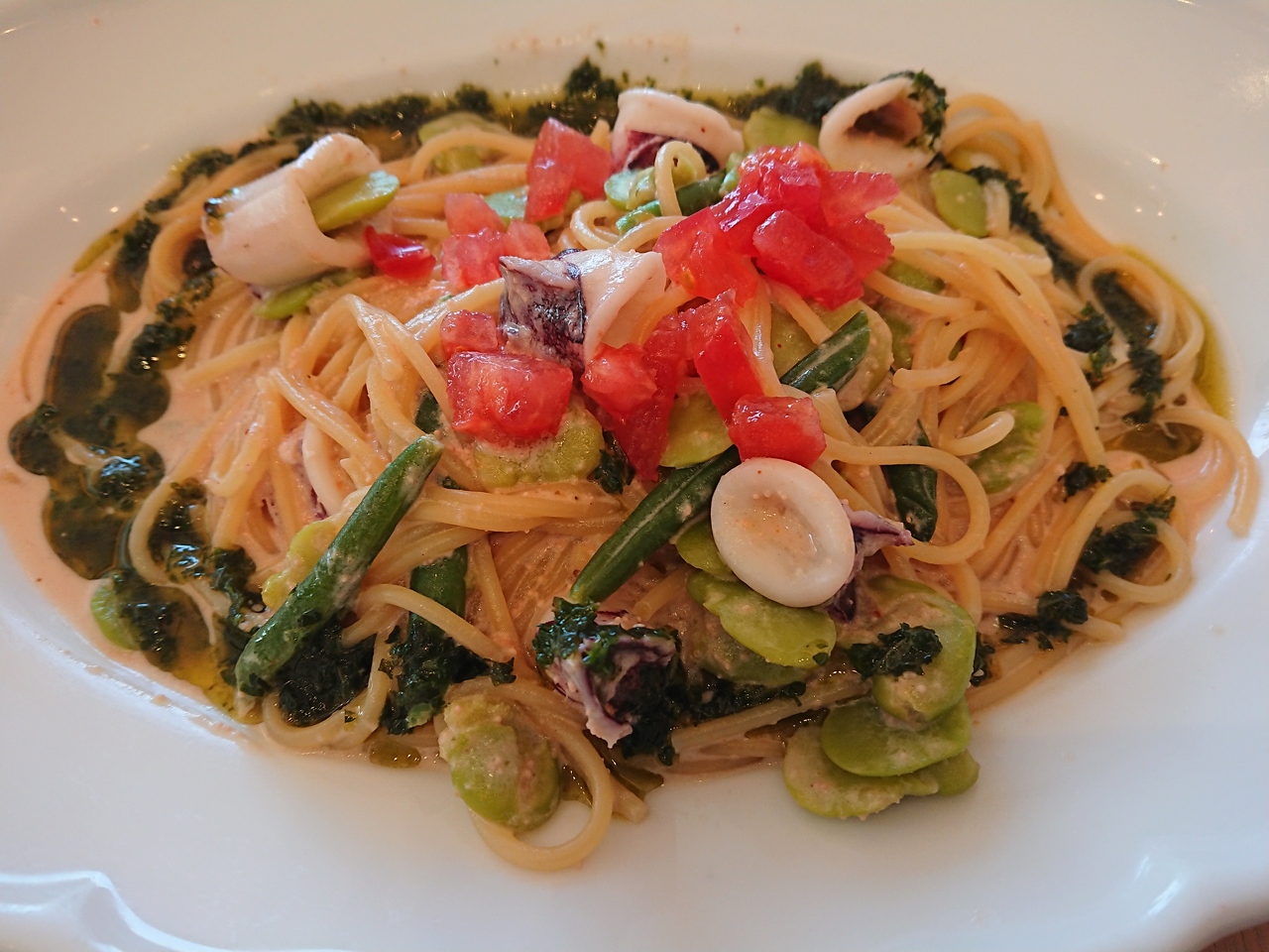 トマトやイカも入っており、パスタのまわりにはジェノベーゼソースもかかっていて、彩りは綺麗。