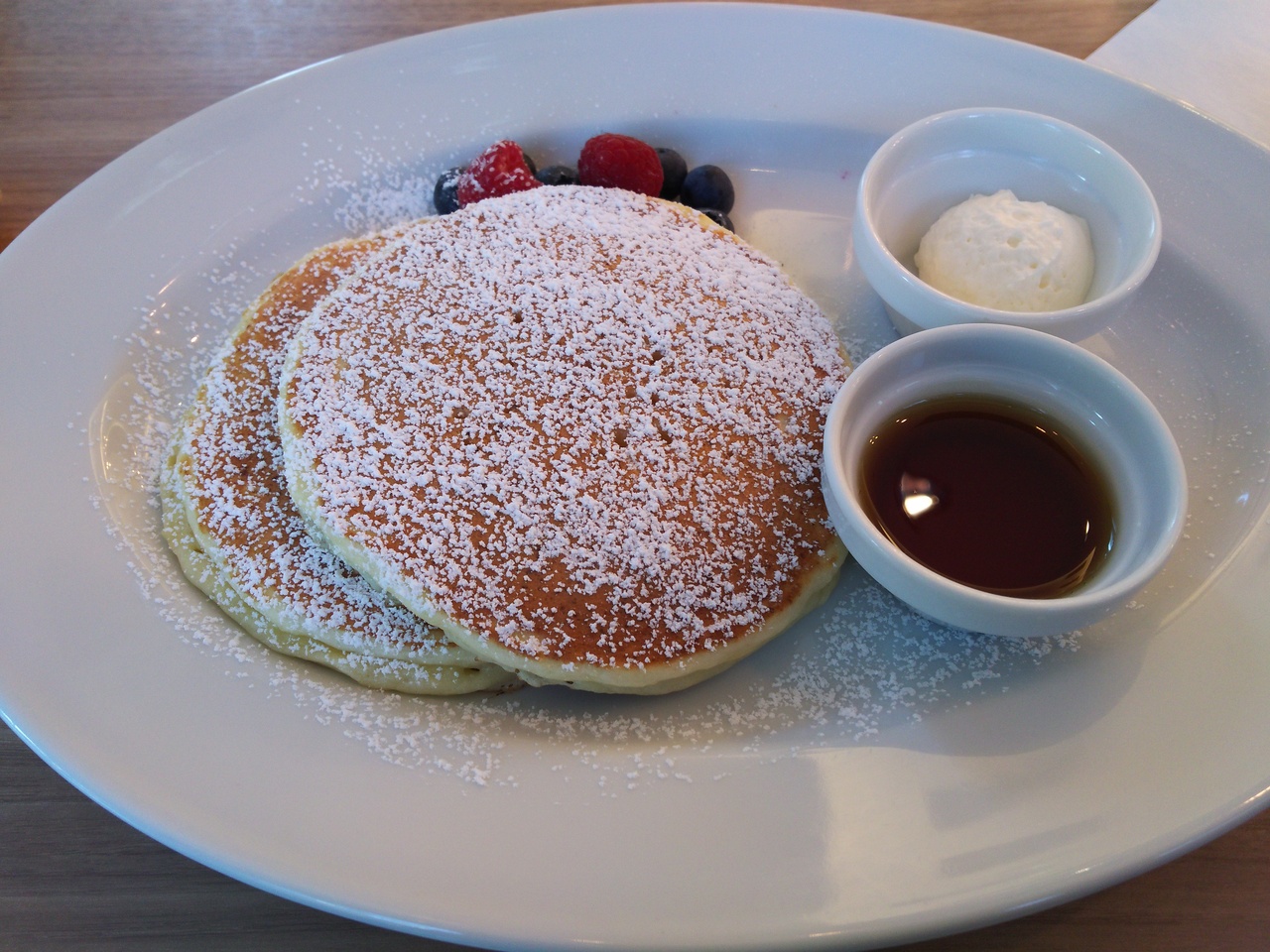 エッグベネディクトとパンケーキをハーフサイズでどちらも楽しめるメニューを注文。