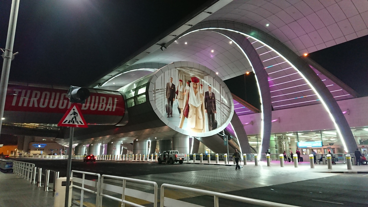 空港の外から写真を撮ると、ドバイっぽいスチュワーデスさんの看板があります。