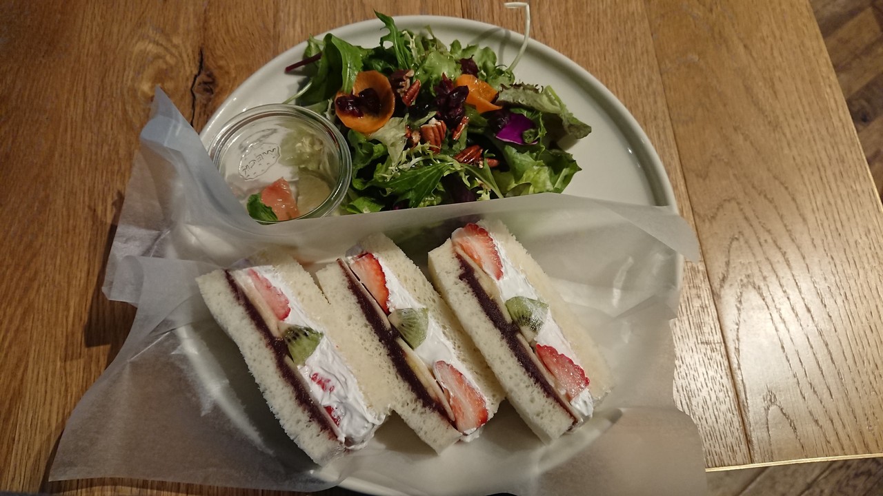 注文したフルーツサンドイッチは、生クリームとあんこ、3種類のフルーツ(いちご、キウイ、林檎)が入っていました。