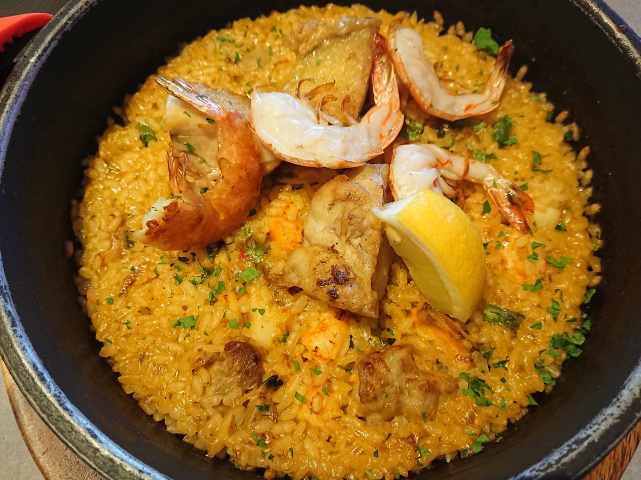 注文した魚介と鶏肉のミックスパエリアは、海老、ムール貝、浅利、鶏肉が入っていて、かなりボリュームも食べごたえ有り。