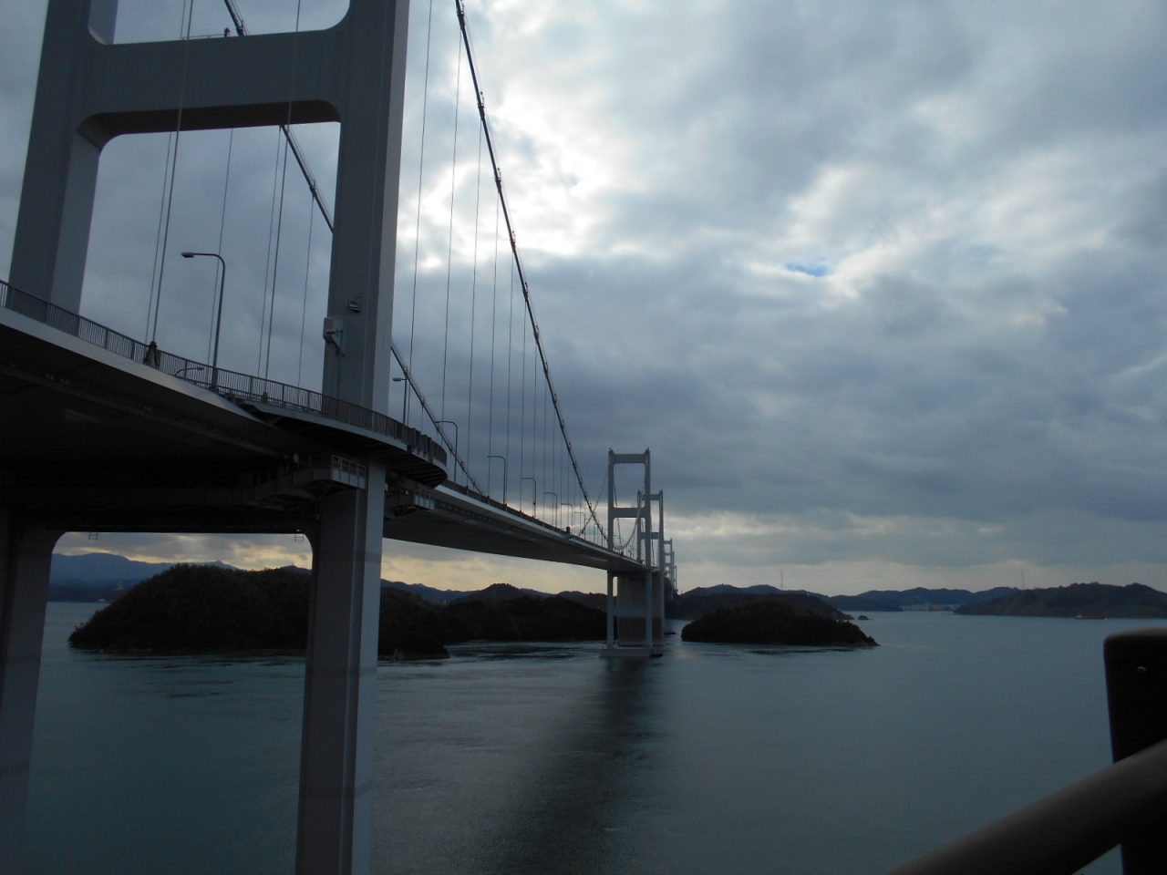 しまなみ海道の最長の橋、来島海峡大橋です。三連橋で長さ4キロにもなります。また高速道路であるにもかかわらず歩いて渡れる世界でも珍しい橋となっております。高さもさることながら景色も素晴らしいのでおすすめです。地元の方はウォーキングやジョギングをしている方もおられて羨ましい限りです。春から秋は自転車の通行量が結構あるので接触しないよう注意が必要です。