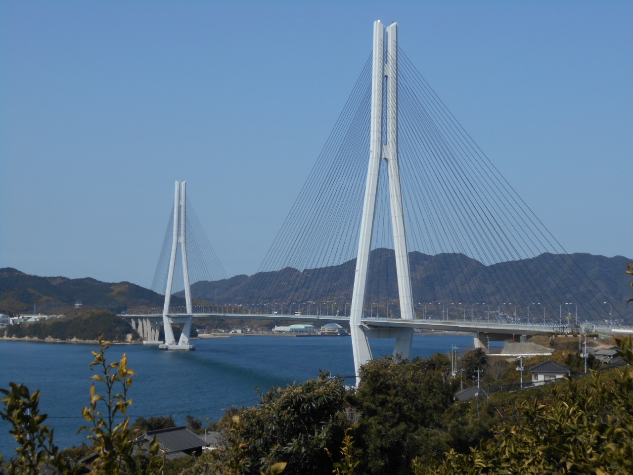 しまなみ海道の7本の橋の中では一番美しい橋と言われています。二本の支柱から延びるワイヤーが綺麗な斜陽橋です。バスでも行けます。高速バスで瀬戸田PAは乗降できるので観光に向いています。上り線はレストラン、お土産も揃っています。因島側には道の駅、多々羅しまなみ公園があって食事、買い物も楽しめますのでのんびり歩いての観光もできます。