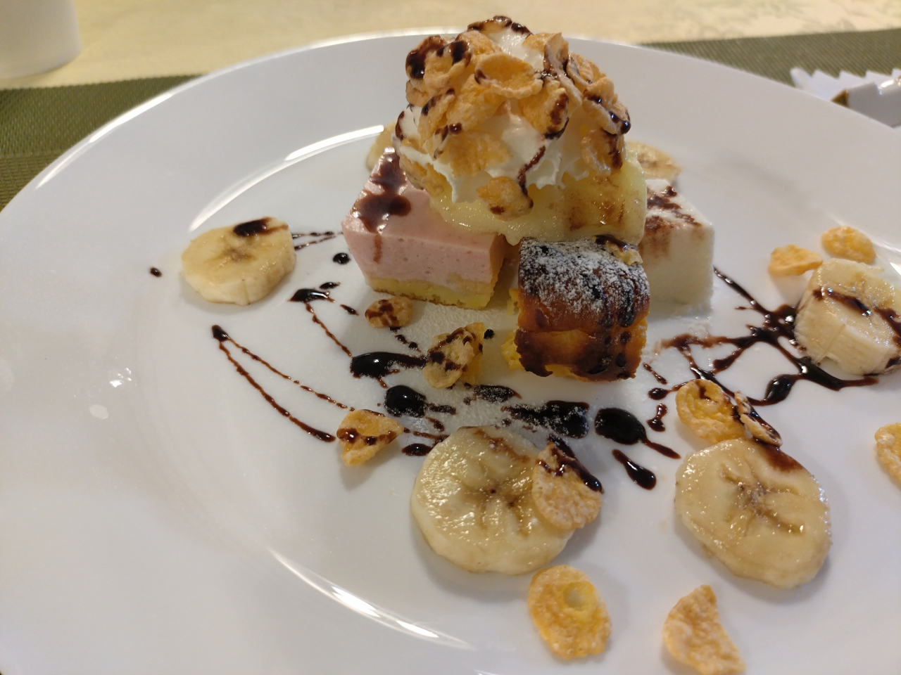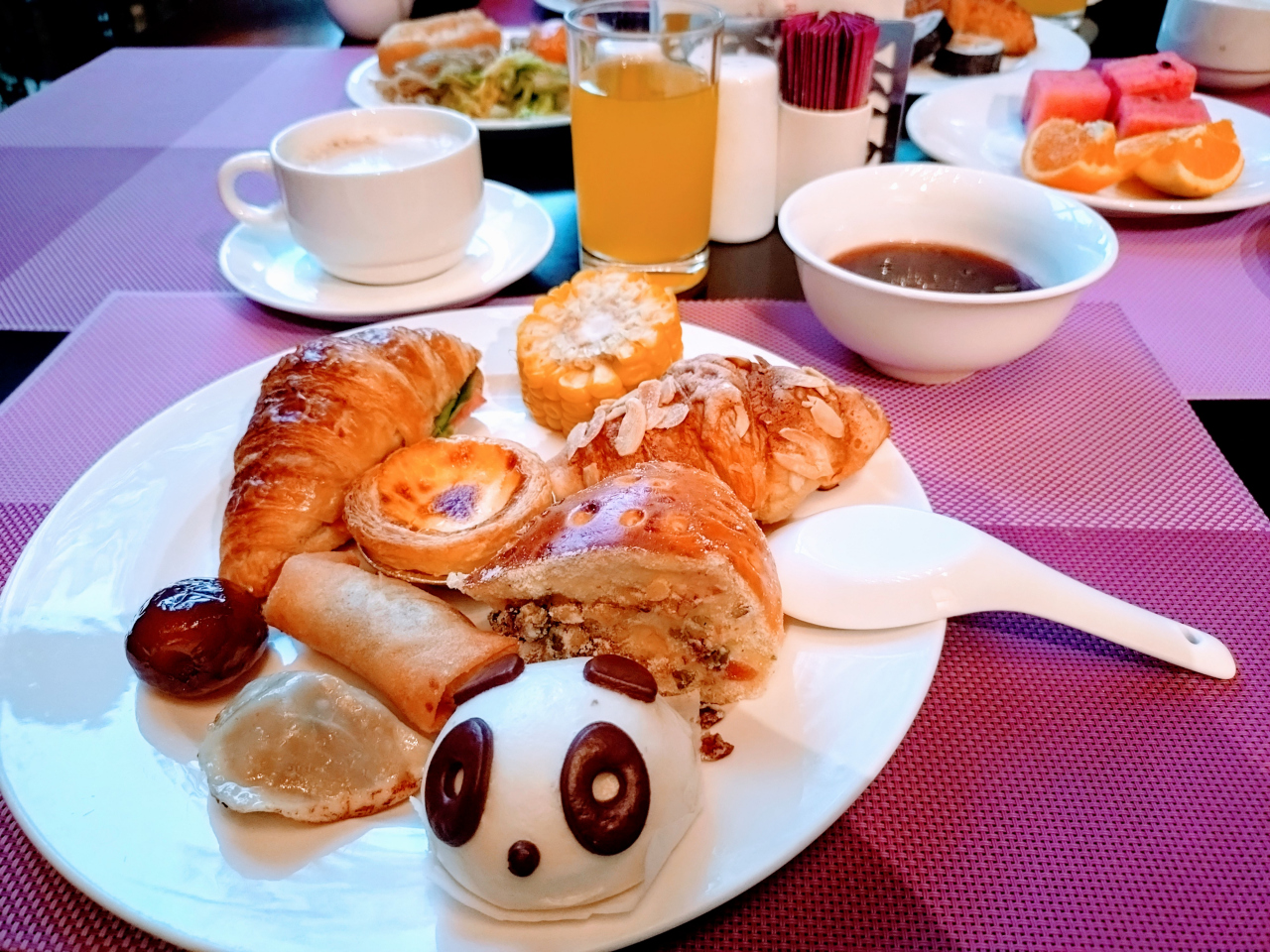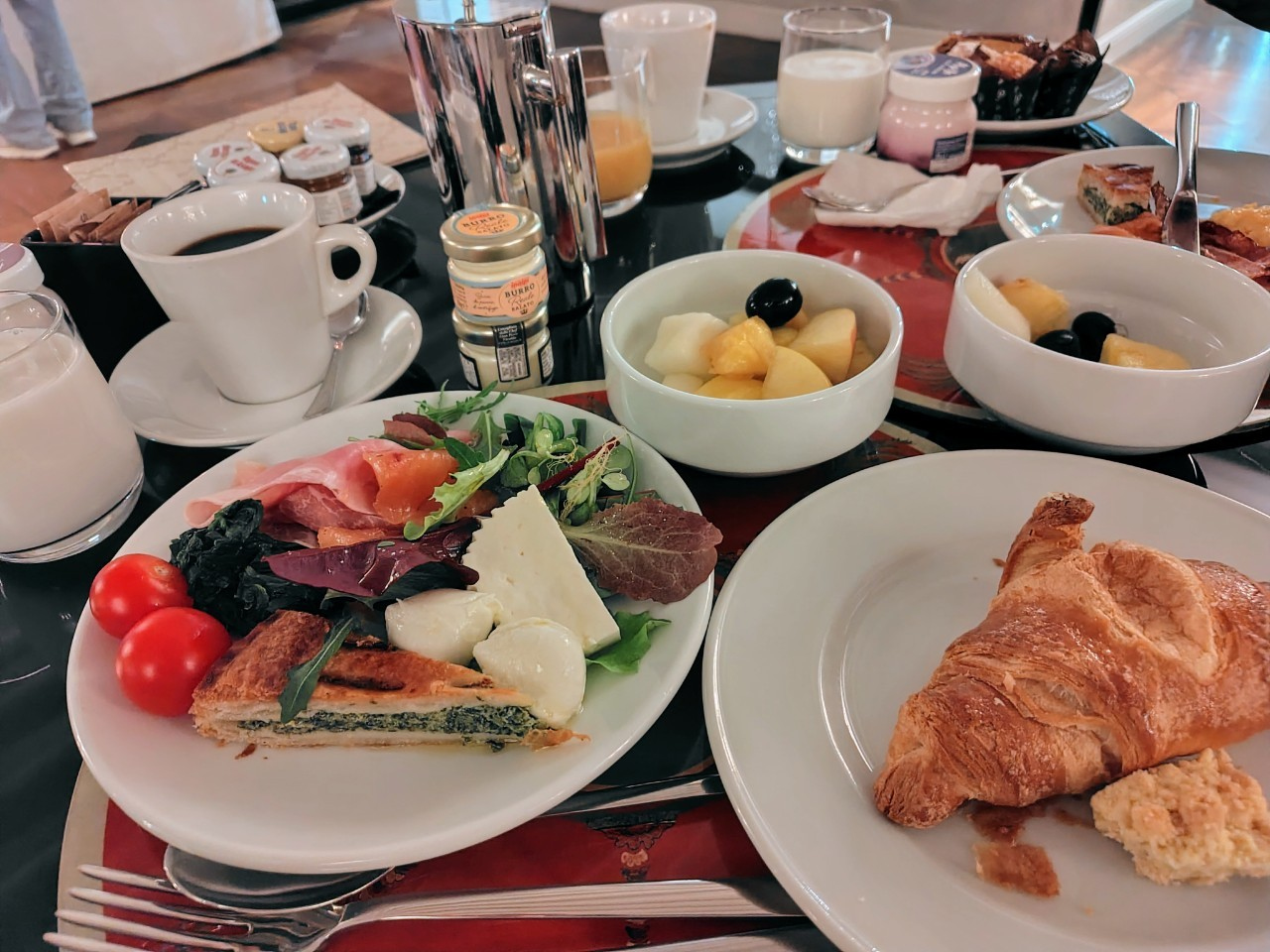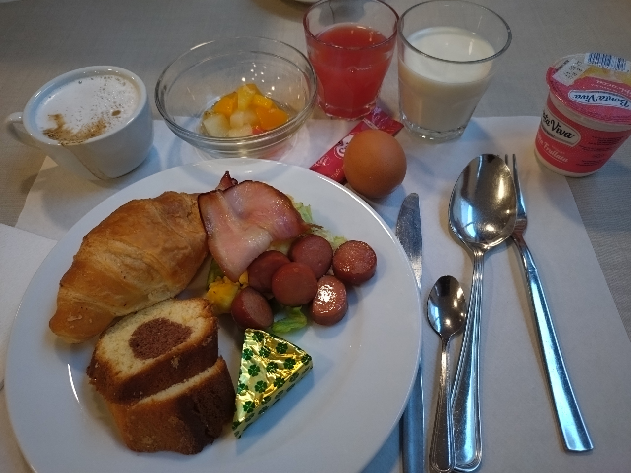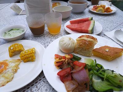 朝食の種類も少な目で、フルーツが生フルーツではなくて、缶詰のミックスフルーツだったのには、驚いた。