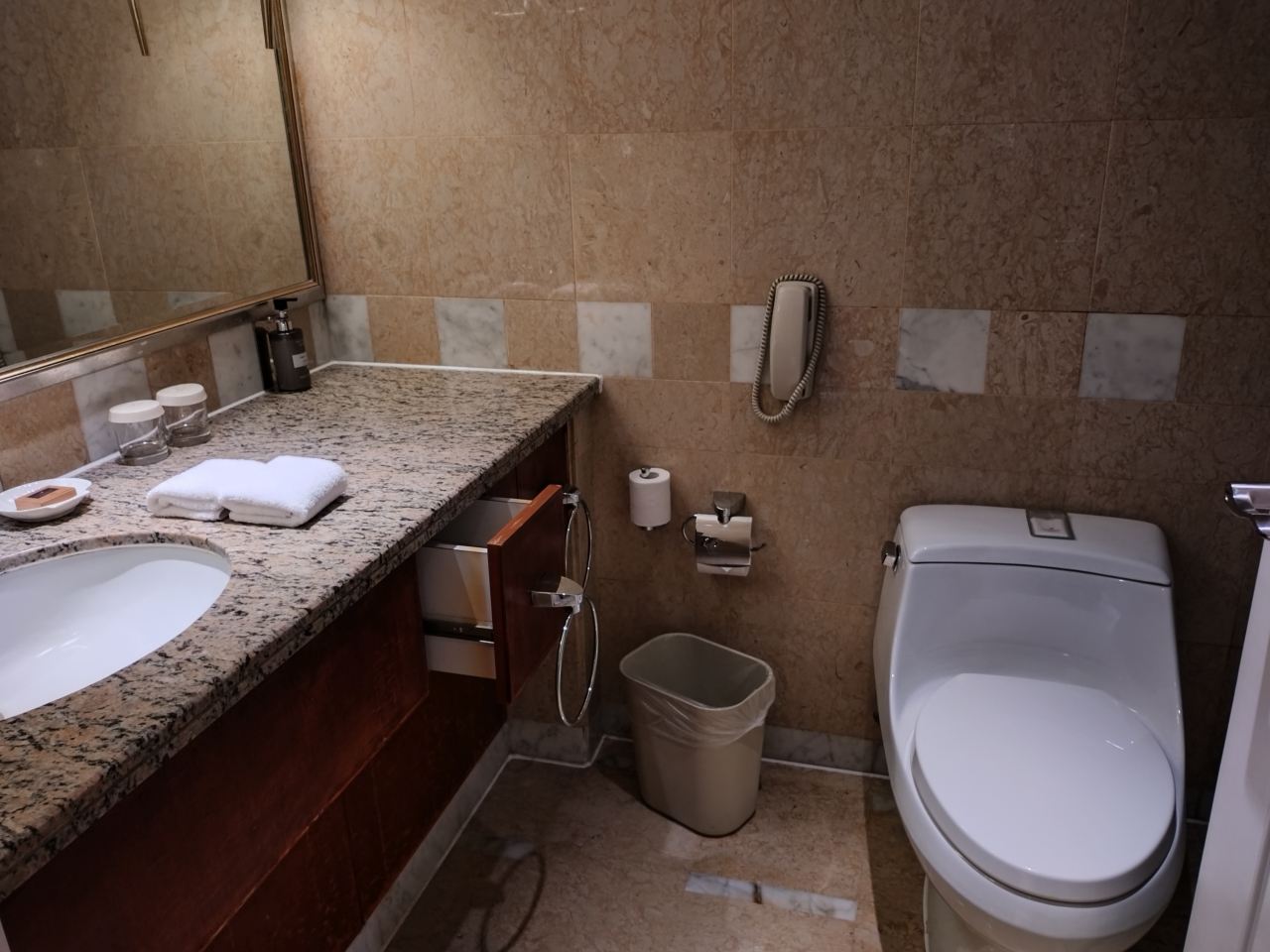 部屋に鏡が無いので、化粧するときにバスルームを利用することに。