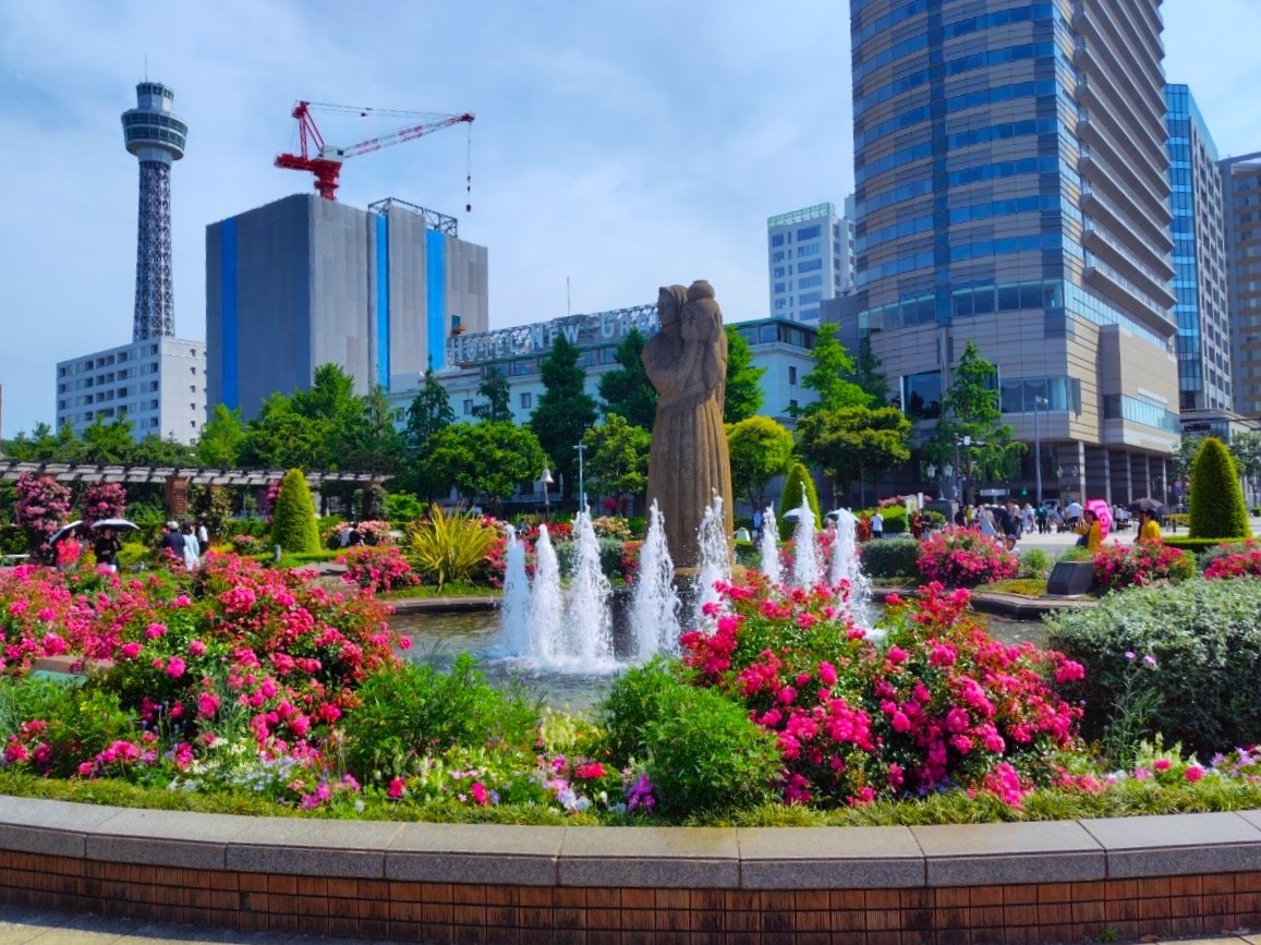 噴水の真ん中に立つ「水の守護神」の像、バラ園のそば「ガールスカウトの像」かもめの水兵さんの歌詞の石碑、足湯のそばの「インド水塔」は、とても目立つのでいつも目にしますが、赤い靴の女の子を見つけるミッションは今回も達成できず。- 旅行時期