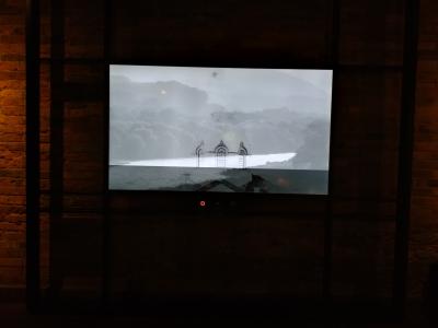 水の階段を下りると、イベントの準備のためテントを設営している様子。