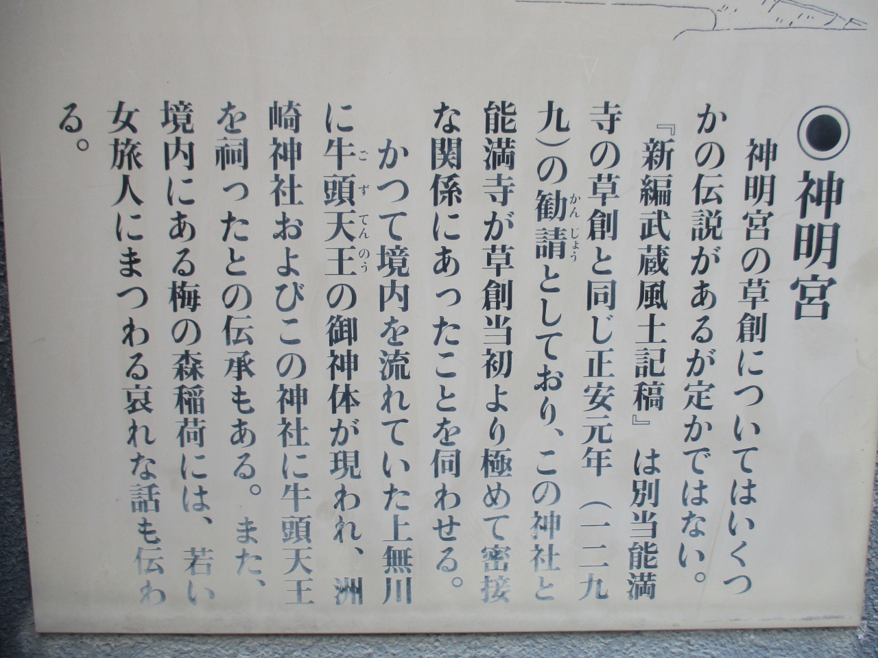 かつて境内を流れていた上無川に牛頭天王の御神体が現われ、洲崎大神及びこの神社に牛頭天王を祀ったとの言い伝えあるそうです。
