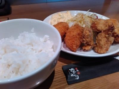 今日は、カキフライを食べたくて、昼時「をどり」 に行きましたが、メニューに見つからず、カニクリームコロッケと唐揚げ定食を注文。