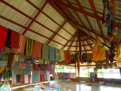 街道の右側の高床式の建物の手摺には、いつもの織物がぶら下がり、近所の女性が織った作品が展示販売されてます。