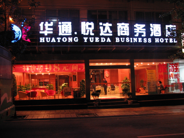 GW中でスタンダード108元、デラックス118元という価格(通常は10元安)の近代的ホテル。設備は3ッ星クラスで改装で日本のビジネスホテルのちょっと広い版です。交通の便も成都旅遊バスターミナル(新南門バスターミナル)まで20秒です。食堂や小さなスーパー、按摩屋もあり成都観光にはピッタリの宿です。