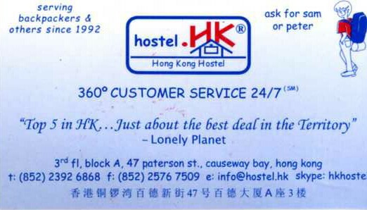 地下鉄銅鑼湾駅E出口を出て2~3分。ツインのホットシャワー、エアコン付きで泊まりました。1泊380HK$(4700円)+キーのデポジット100HK$でした。