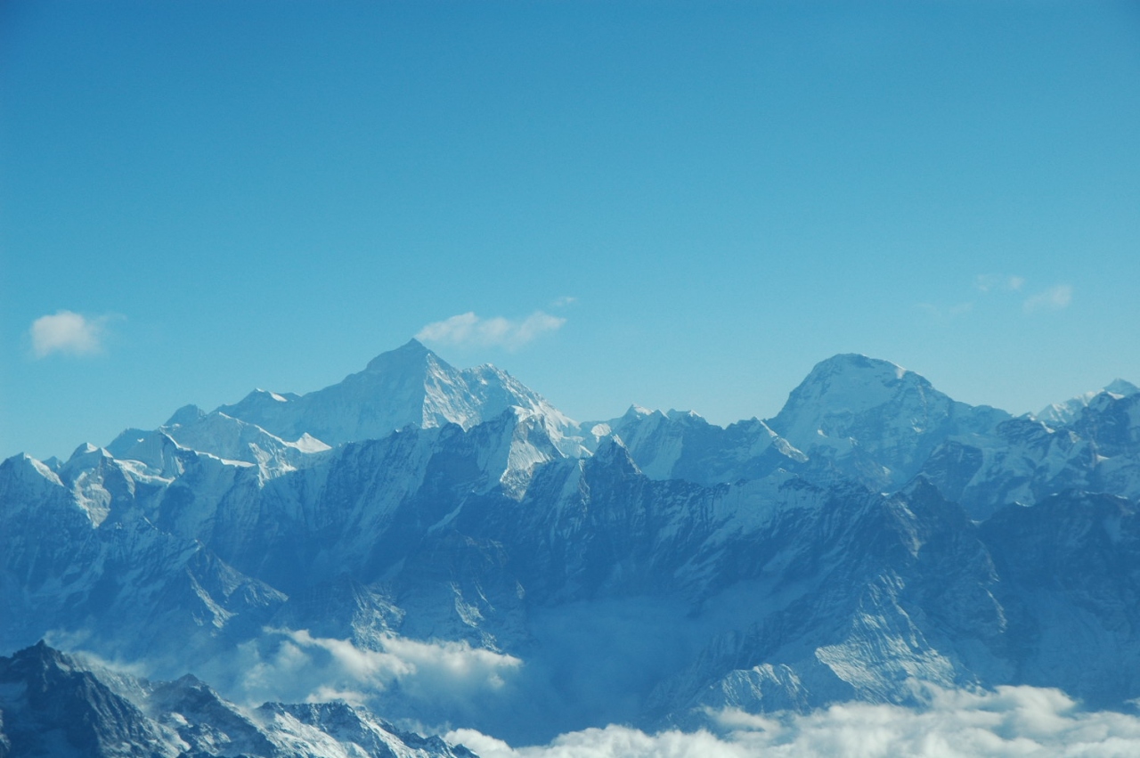 カトマンドゥ空港から約1時間のフライトで上空からエベレスト他ヒマラヤの山々が一望できるマウンテンフライトはお薦めです。飛行機は12人乗りで左右の席があります。ヒマラヤ接近時に山に近くなるので右側のほうがいいと思います。また正面にヒマラヤが見える時、乗客を順にコックピットに入れて山の説明をしてくれます。写真の正面やや左の雪が吹流しのようにたなびいているのがエベレストです。こういう風に山が見えますよ。
