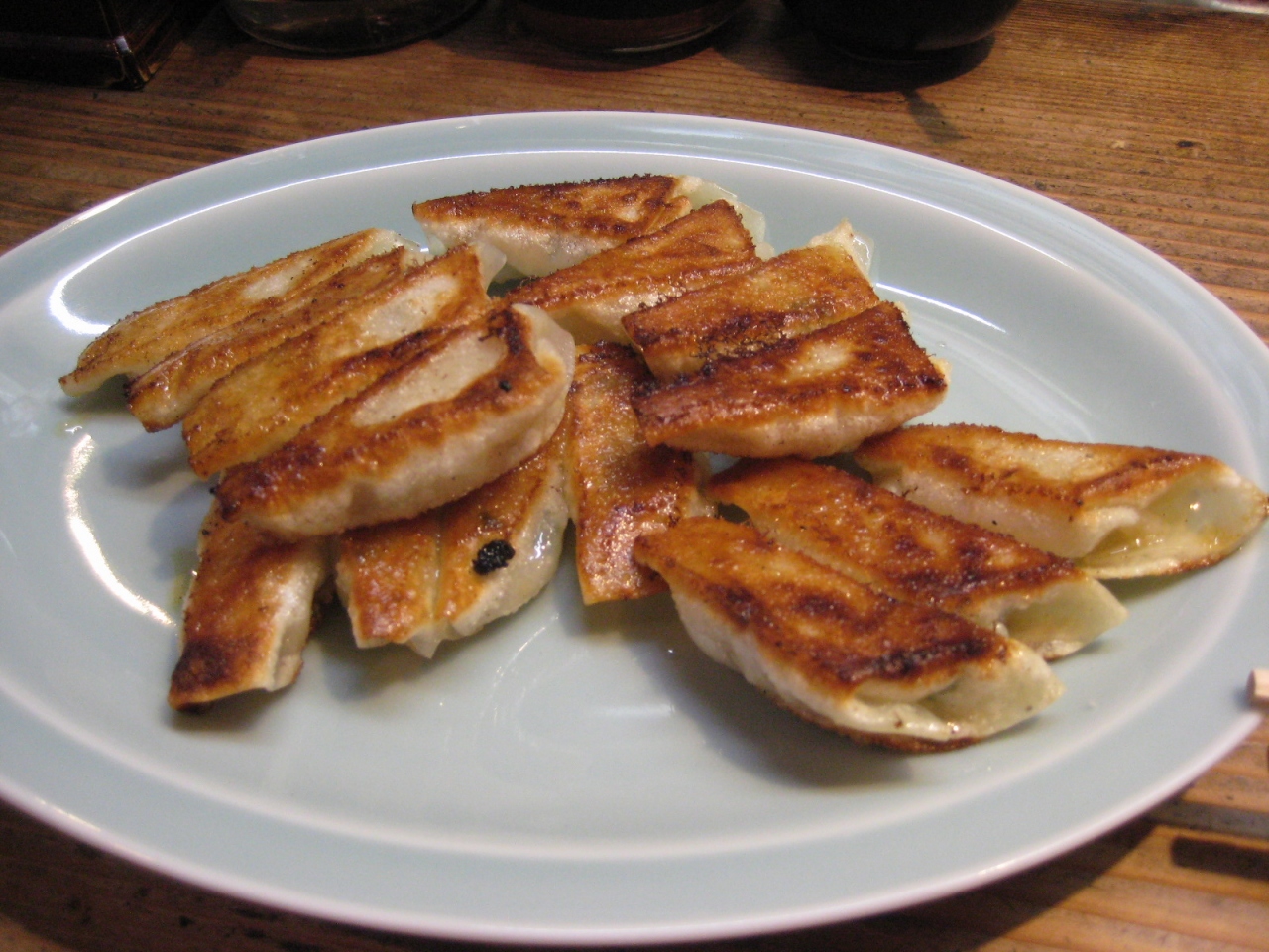 注文を受けてから、若い店主が、手際よく餡を皮に包んで焼く餃子は、小ぶりだけどパリパリで美味。
