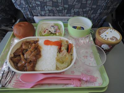 機体のペイントはもちろんのこと、枕、化粧室のアメニティ類、CAのエプロン、ヘッドフォンが入ったビニール袋、機内食のカトラリー、アイスクリーム等等、色んなところにキティちゃんが・・・
