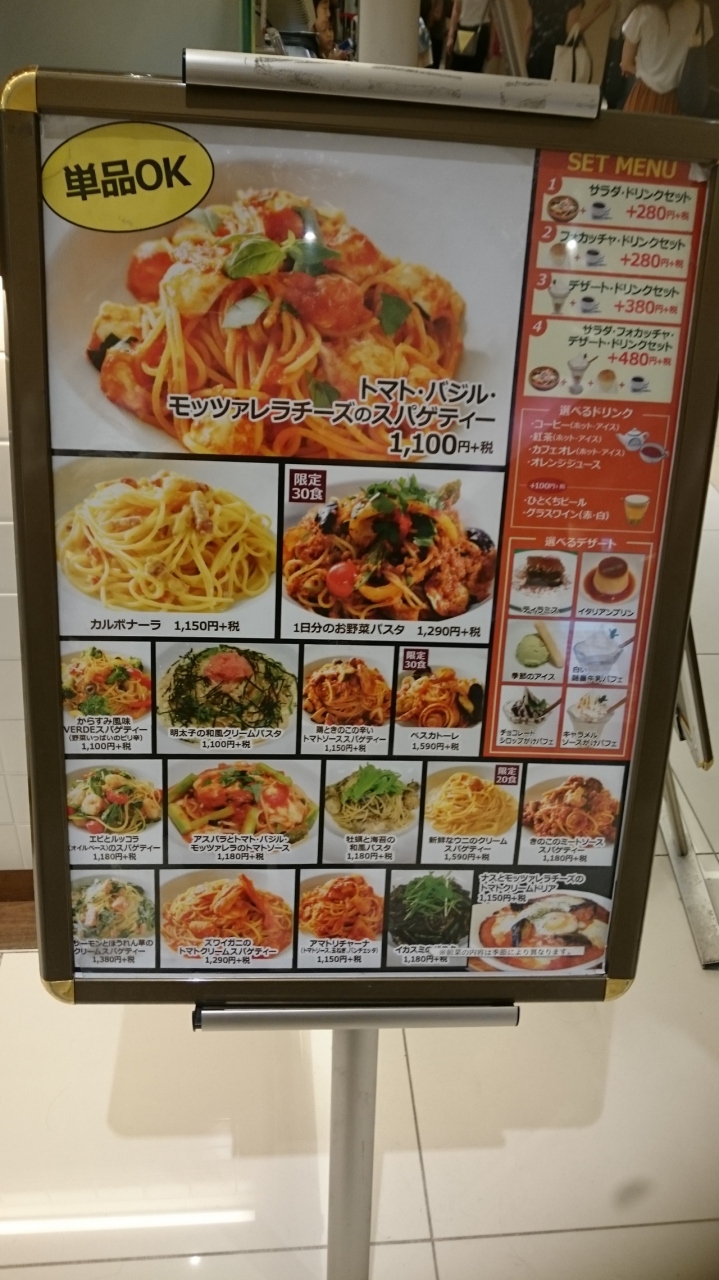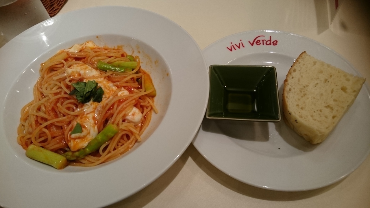 久しぶりにルクアに行ってランチしました。日曜日のせいか、10階のグルメフロアは人が一杯。もう、ここはどこ?状態でした。行列できていましたが、15分程で座れました。全然、落合シェフの事は気づかず、食べた後で知りました。ランチは色々パターンあり。好きなパスタを選んで、フォカッチャとサラダとデザートとドリンクセット(480円)にしました。パスタはトマトとアスパラとモッツァレラのパスタ(1180円)にしました。見本通り、モッツァレラがたくさん入っていてかなりボリュームあって私好みです。デザートもソフトクリームみたいなのにしました。濃厚でおいしかったです。雰囲気もオープンでスタッフの方も明るい感じでした。