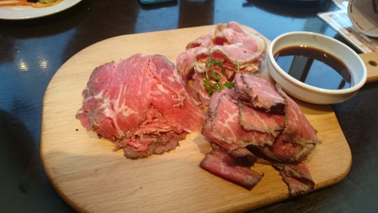 2回目の利用です。予約していたので、座敷に座れました。お肉料理、イタリアンが食べれます。店内はカップルや若い女子でたくさん賑わってました。ローストビーフ食べ放題、生ハム食べ放題、飲み放題、サラダ…。5人で、23000円と私達にしては少しお高めでしたが、お肉堪能しました。他にもステーキとかありました。生ハムは塩味が効いてるのでパンに挟んで食べました。サラダも野菜は瓶詰めでおしゃれでした。
