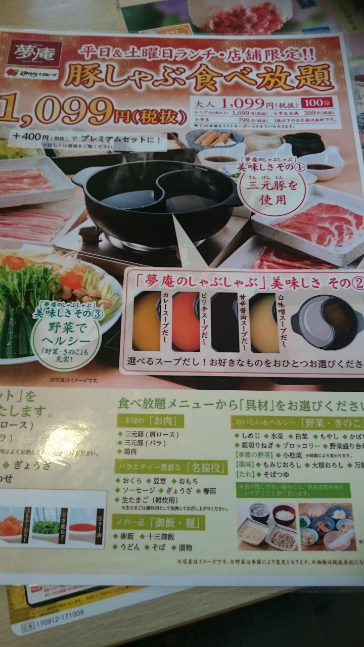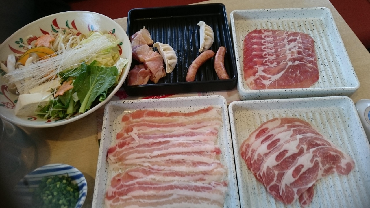 ランチのメニューです。某グルメサイトで予約すると、5%オフでした。豚しゃぶとなってますが、鶏肉や餃子、ソーセージ、餅、うどん、ご飯など、十分な内容でした。 豚肉はロースとバラ肉の二種。クセもなく美味しかったです。ご飯は白ご飯と十三穀米があって、十三穀米は体にもよさそうで味もよくお代わりしました。だしは基本の昆布出汁と4種類(醤油、味噌、ピリ辛、カレー)の中から選べます。豚しゃぶ食べ放題税込1187円。ドリンクバー税込237円です。場所はうちの場合、車でないと不便かなぁ。お腹いっぱい満足でした。