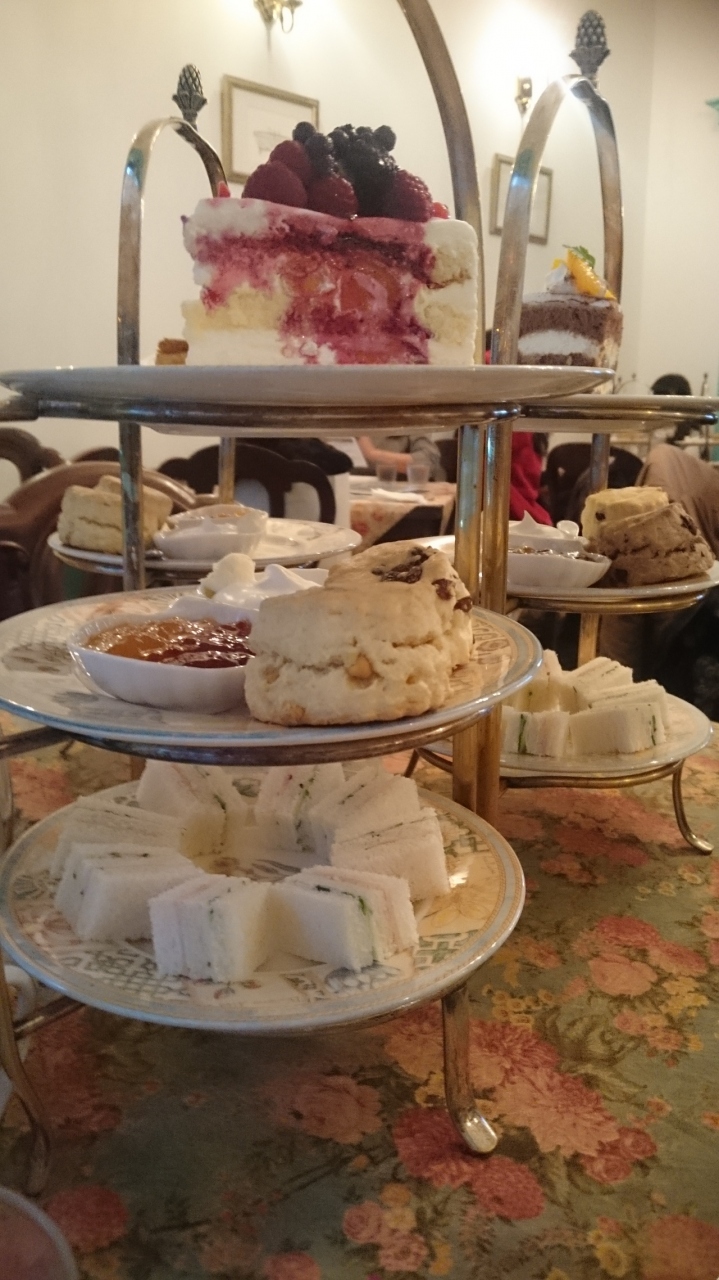 大阪に住んでいながら今日初めて知りました。北浜にこんなに本格的な英国式アフタヌーンティーがあったことを。1時間並びました。お店は名前の通り、レトロな建物で、重要文化財です。一階はスコーンやケーキ、紅茶や雑貨が売られています。雰囲気も歴史感じる造りです。二階は喫茶です。ケーキやスコーン、サンドイッチにドリンクでもいいですが、私達は夕食も兼ねてアフタヌーンティーセット(2400円)にしました。好きなケーキ1つ、スコーンは2つ、サンドイッチのお皿の3段重ねとドリンクです。私はベリーのケーキ、レーズンとアーモンド?のスコーン、アールグレイの紅茶にしました。ケーキはクリームがとってもとっても美味しかったです。スコーンもクリームとマッチしててジャムもついてましたが、クリームがとろけるようにベストでした。テンション上がりました。今日は19時閉店でした。