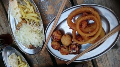てんしばに集合!!と言われて駅の案内でするする歩いて来たら、こんなにコジャレたところがあったなんて。元同僚が集まってBBQしました。サイドメニュー食べ放題、飲み放題で3900円、二時間制です。BBQ以外にもビヤホールとか色々あるみたいです。最初に豚、牛、鶏やウインナー、野菜がドンと持って来られ、後はサイドメニューとドリンクはおかわり自由です。ドリンクはラムネ、ソフトドリンク、アルコールと種類が豊富。アイスもあるし、サイドメニューはポテトや鶏のカラあげや揚げ物、カレー、キムチ、野菜などお肉食べる前にお腹がふくれます。バックの音楽も少し前に流行ったJポップが流れてました。外のテラスで少し暑かったですが、気分はハイになりました。