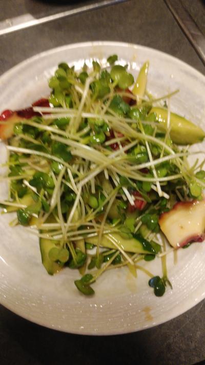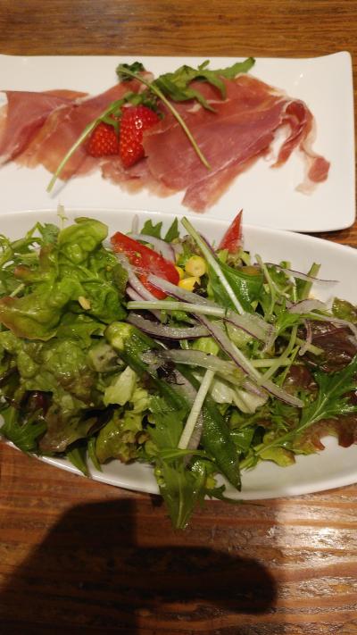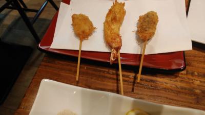 祝日の為予約しましたがしなくても空いていました。ペアセットで注文。ワンドリンク付、たこ焼き(二個)、串カツ3本、サラダ、生ハム、ピザ、パスタ、デザートで4000円なので1人2000円。ボリュームあって、ピザは大きくて食べ応えありました。場所は阪急からならすぐですが、阪急一番街とちょっとわかりにくいかも。