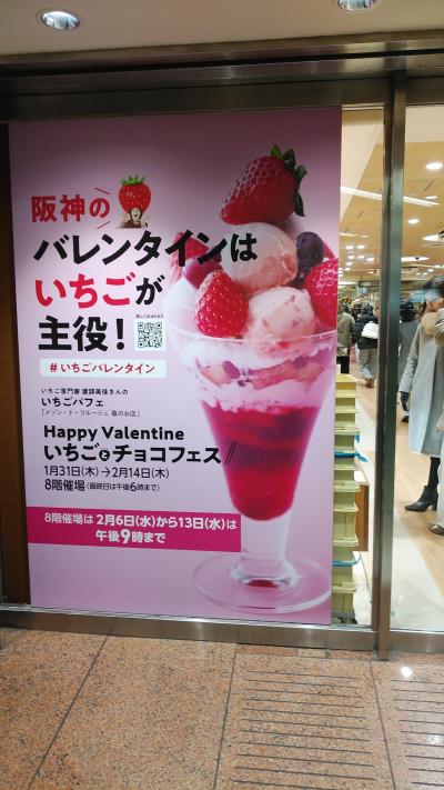 百貨店ほ今どこもバレンタインの催事してますが、阪神はイチゴとコラボ企画のようでイチゴとチョコフェスを8階でしていました。チョコは試食もありたくさんありすぎて困るくらいでした。イートイン出来るショップもあってクレープ食べました。ものすごい賑わいで来週はもっとスゴいかなあと思いました。