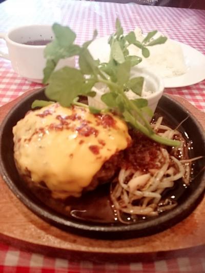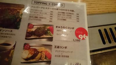 枚方市駅近く。ぷらっとランチを食べに行きました。お店は今風のおしゃれな感じです。黒毛和牛でレアな状態のハンバーグ。サイズ、ソース、トッピングが選べます。今日はサイコロステーキもついた、「きゅうろくコンボ」で、ゴルゴンゾーラチーズにしてみました。レアなんでジュージュー焼きながら食べたんですが、一口めでお肉の味がいいと思いました。ゴルゴンゾーラがからむとさらにおいしい。ステーキはハーフの量です。塩とわさび(だったかなあ)で食べます。1580円。ごはんはおかわりできます。スープとサラダ付。150円でアイスコーヒー追加しました。