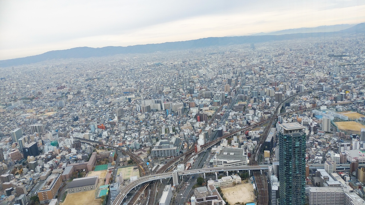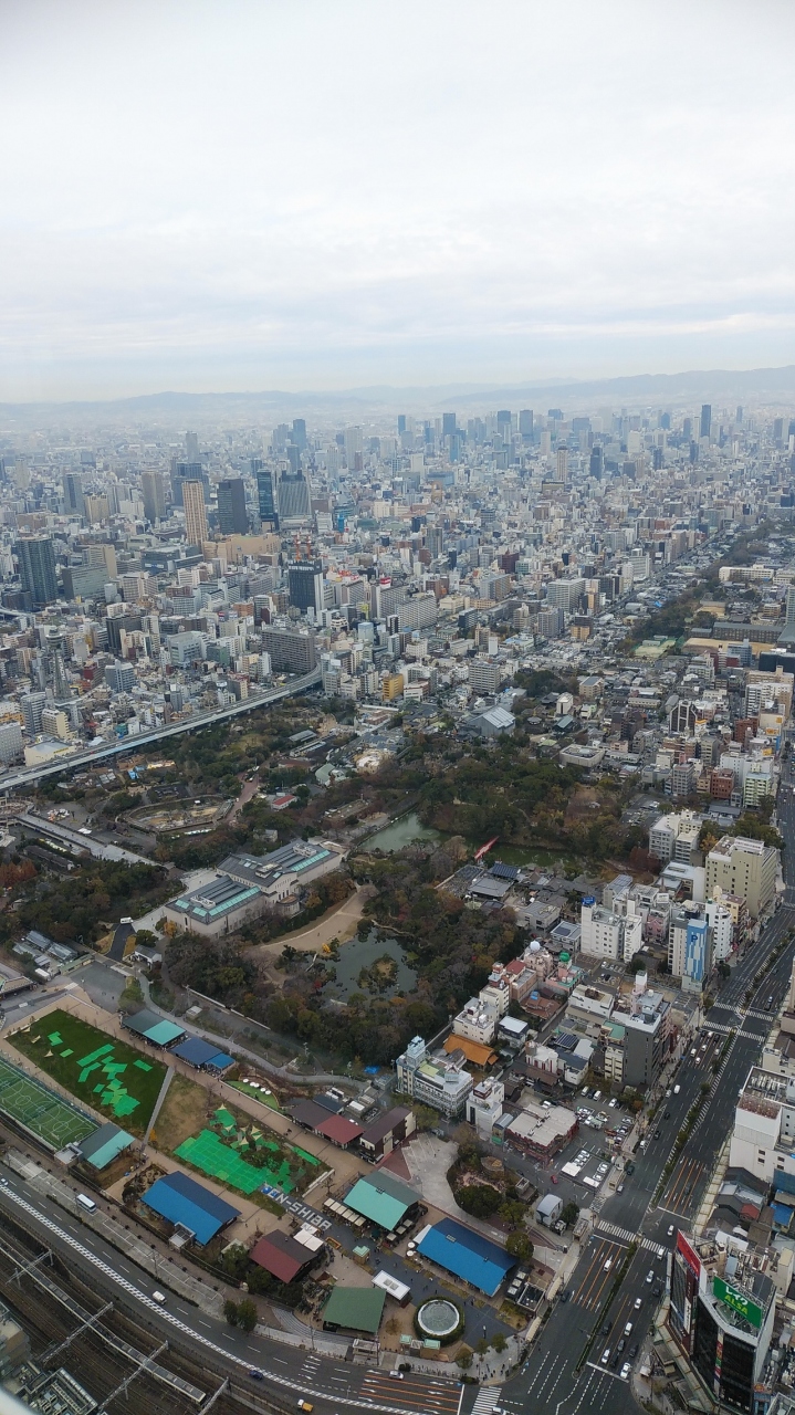 今までは16階までしか行った事が無かったですが、展望台に上がる機会がめぐって来ました。天気は曇りでしたが、360度パノラマは壮観でした。近くの天王寺動物園から大阪ドーム、南港……。大阪一円が見れて楽しかったです。ただ高所恐怖症なので、床がスケルトンの部分があってそこには立てませんでした。