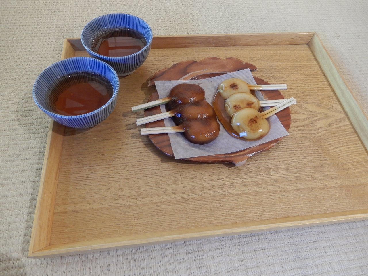 地元在住の人に「ぜひ」と言われて食べました。とっても”おいしい”。じゃんぼ餅とのことですが、大きさは一口サイズで食べやすく、6本で310円ととてもリーズナブル。しょうゆ、味噌、黒糖と3種類あって2種類セレクトできます。今回はしょうゆ、味噌味にして2人でシェアしました。ドリンクセットもありましたが、お茶なら無料です。庭園散策とともに楽しめます。