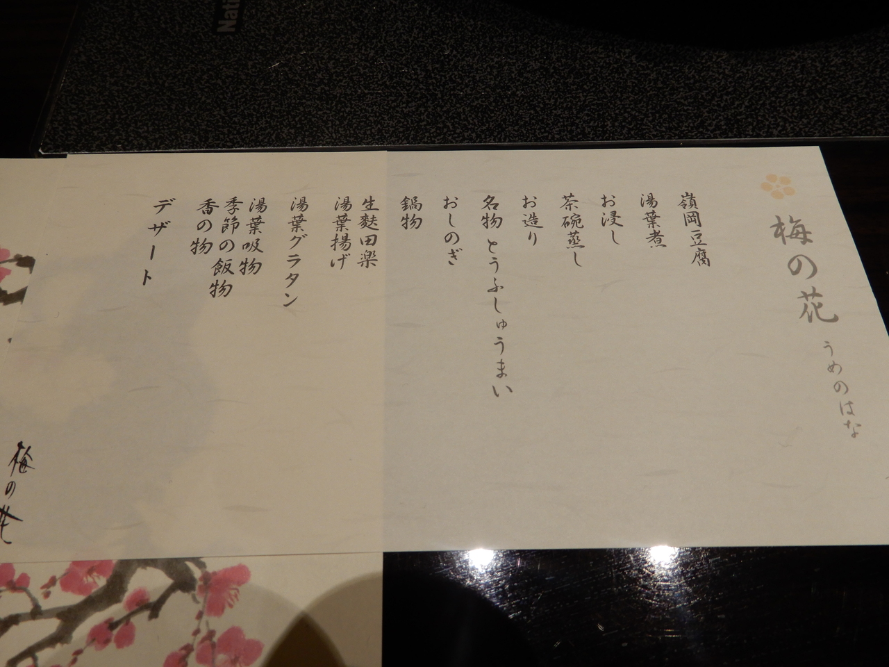 いつも月1で御飯食べる友達と予約して新年会しました。豆腐のフルコースで鍋あり、湯葉あり、グラタンあり。最後のほうにごはんが出て来て食べれるかと思いましたが、食べれました!!お茶も香りよくてとっても美味しかったです。ドリンクを1杯頼んで、1人5000円位。デザートは二種類から選べます。ちよっと値がはりますが、個室でゆったりできました。