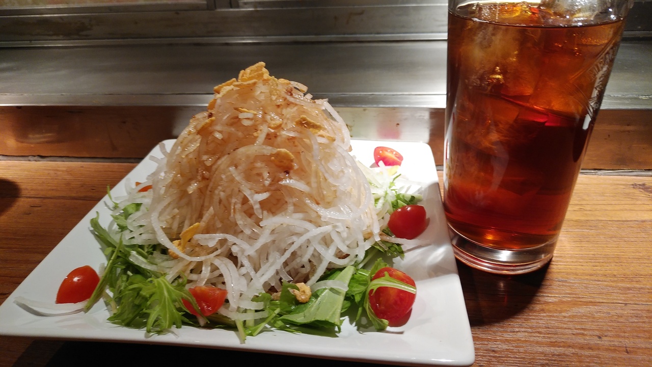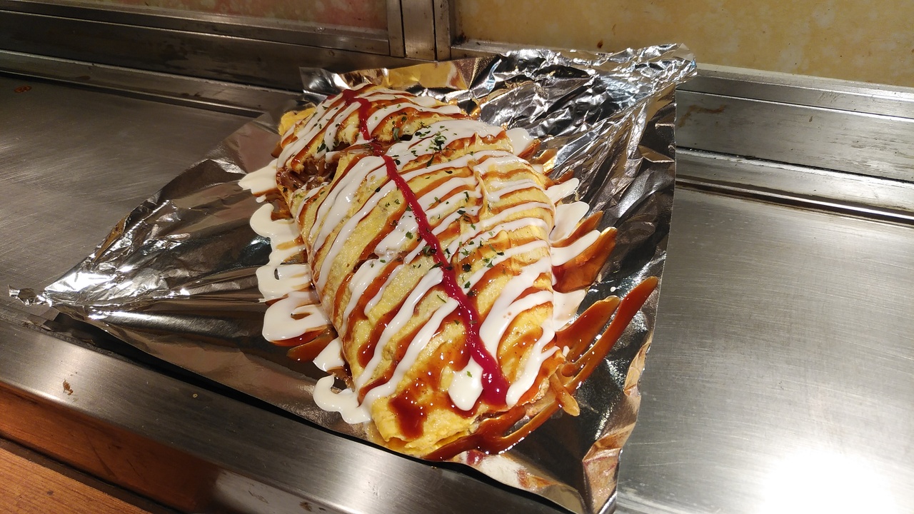 年末、いっぱいで入れなかったので予約してリベンジしました。当日予約だったのでラスト一席でしかもカウンター。テーブル席に変更できないか電話してみたけど無理でした。そんなに人気!?と期待度マックスで入店。やっぱりいっぱいの人で大根サラダは注文してすぐ出てきましたが、お好み焼きやオムそばはなかなか来ませんでした。オムそばはアルミ箔にのって出て来て、コテで切ってたらぐちゃぐちゃになりましたが、味は美味しかったです。お好みもエビやイカがしっかり入ってました。串は1本からオーダーできて、オクラやアボカドを1づつ頼みました。ウーロン茶1杯飲んで、5%クーポン券使って1人2000円程。安いけど、接客含めてまあまあかなあって感じです。