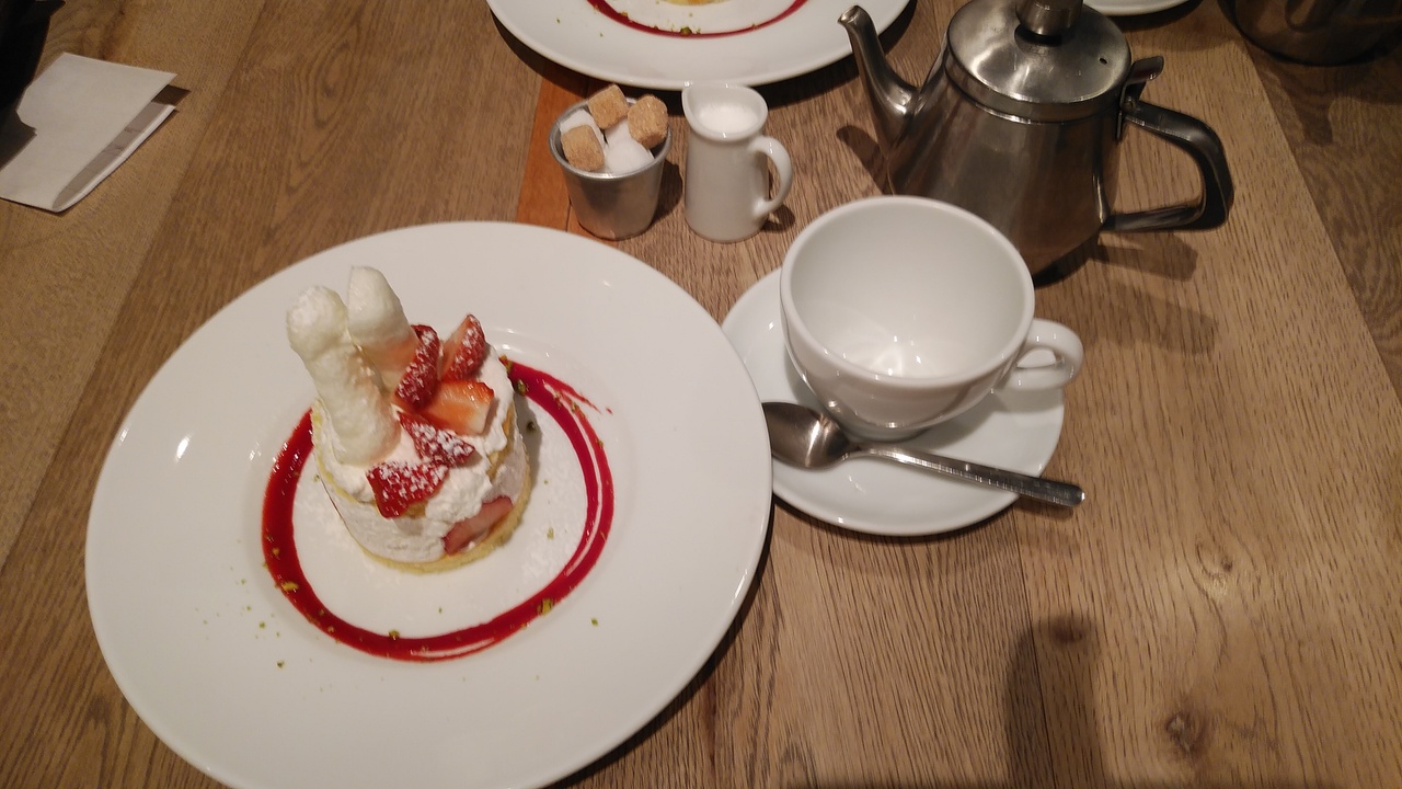 イーマB1のおしゃれなカフェ。時間帯によっては席があくまで待ちます。雰囲気がスタイリッシュで名前がよくわからなかったです。春が待ち遠しいイチゴのショートケーキと紅茶のセット。1300円。ちょっと値がはりますがインスタ映えするケーキでした。生クリームがたっぷりでおいしく、耳らしきものがついててウサギをイメージしているのかとっても可愛らしく食べるのがもったなかったです。
