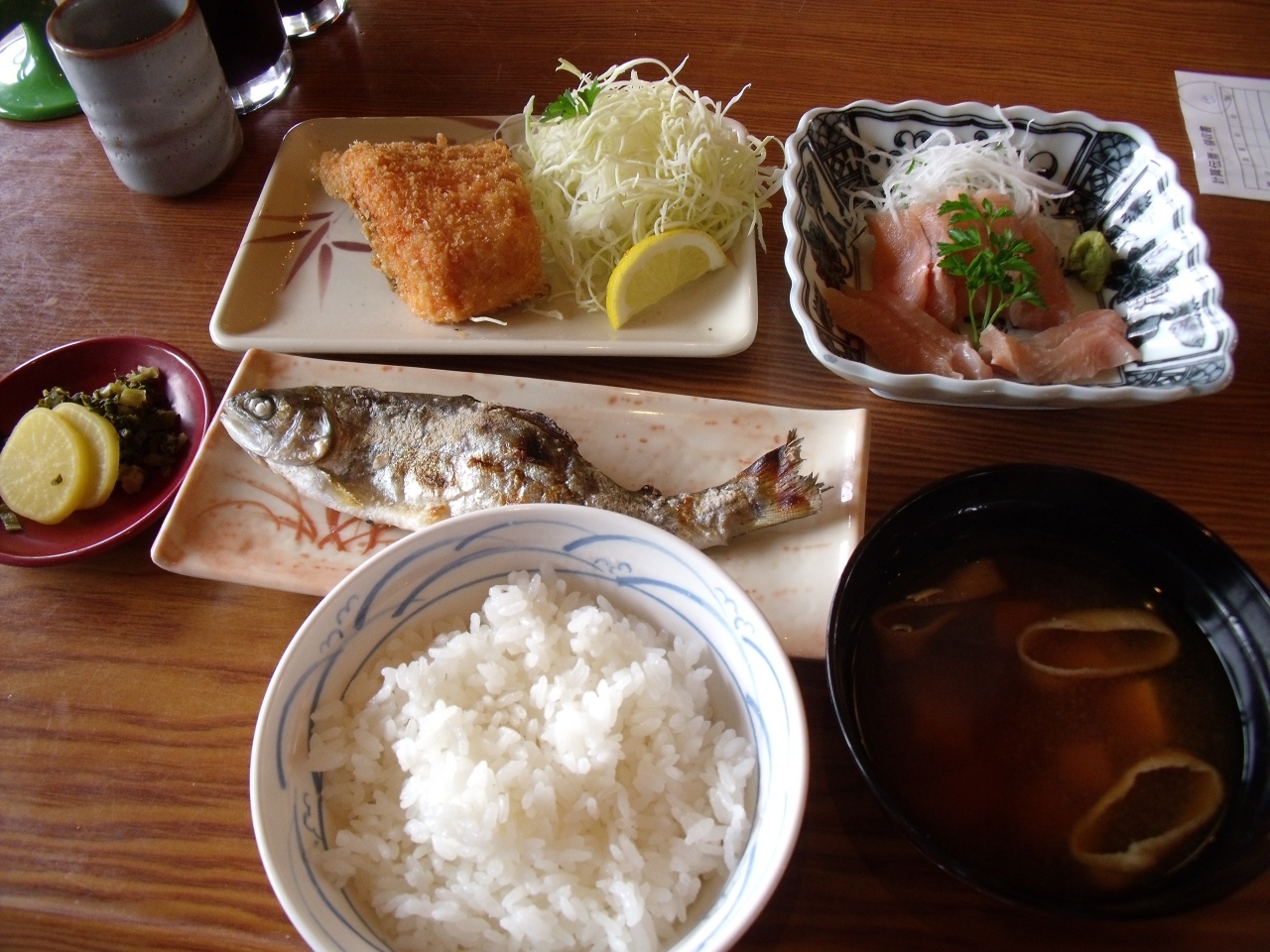 食事処では、生簀から獲りたてのニジマス定食(刺身・塩焼・から揚げ)