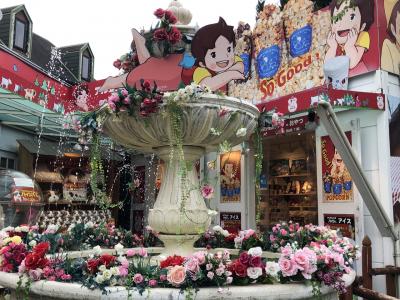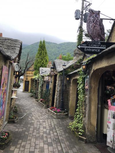 フローラルビレッジは、周りの温泉街の雰囲気とは全く違う欧州の絵本の世界、テーマパークのようです。ハイジのお店、ジブリのお店、画廊やお土産のお店がありました。それとフクロウやウサギ、ヤギに会えます。入口のフクロウのオブジェは錆びて不気味でした。