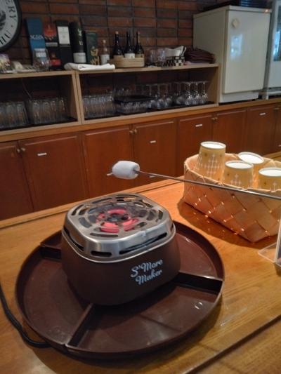 ロビーの横でマシュマロ焼き雨じゃなかったら外の焚き火でできたのに