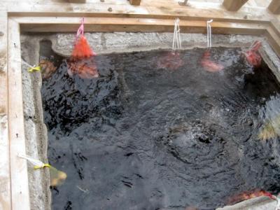 - お湯がボコボコ湧き上がり湯けむりが上がっている。湯筒の周りに編み袋をひっかけるクギが15本ほどあり。卵や野菜の入った編み袋が下がっている。