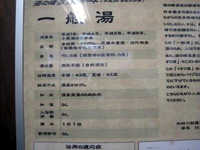 - まさに鄙びた山中の温泉街の中心地にあり周辺旅館・民宿の宿泊客もよく入りに来る。一般湯、くすり湯、つぼ湯の3種類ある。