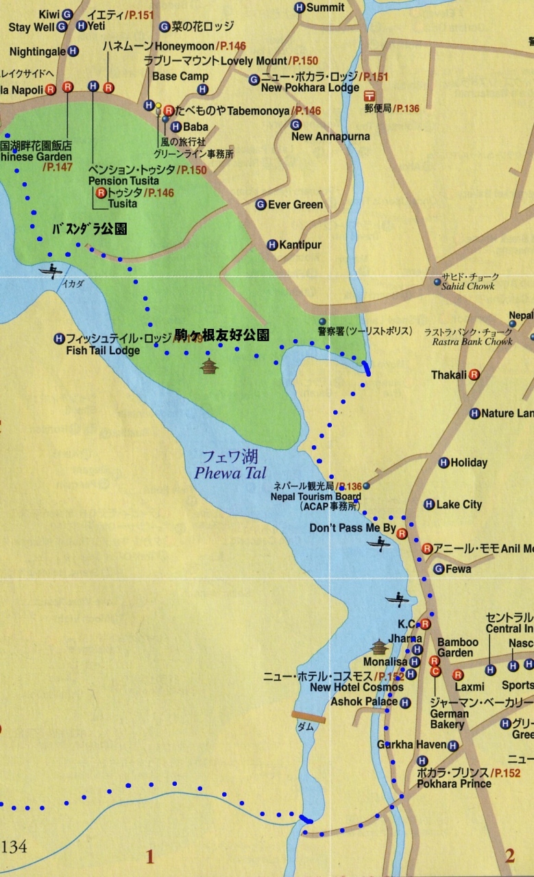 - レークサイドにあるバスンダラ湖畔公園の終わりにフィッシュ・テール・ロッジの渡し舟場がある。そこを横切ると駒ヶ根湯こう公園がある。