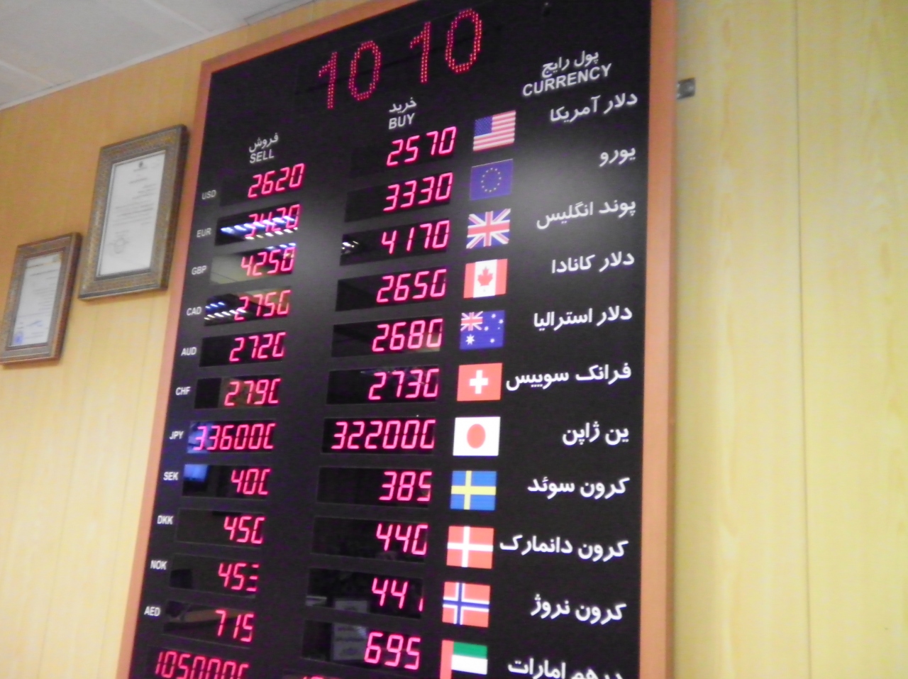 公定レート:$1=12000リアル台,市中レート(フェロドーシ通りの両替商):$1=25000リアル台(2012年9月時点)。