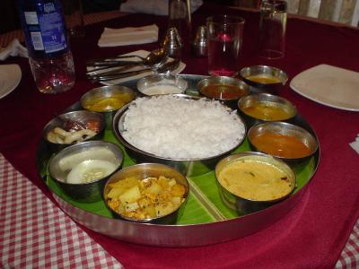 - どうしてもカレー料理となる。高貴な方々が美味しそうに食べていた高級南インド料理:お盆に10種類のカレーが載って、真ん中にご飯のお盆メニュー×