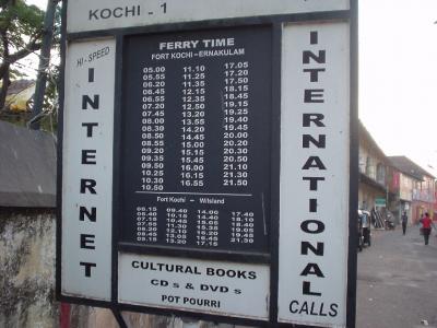 古い街:フォート・コーチンから、新しい街:エルナークラムに行くフェリー乗場の時刻表です。