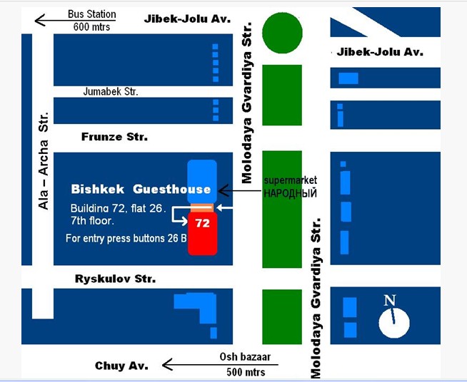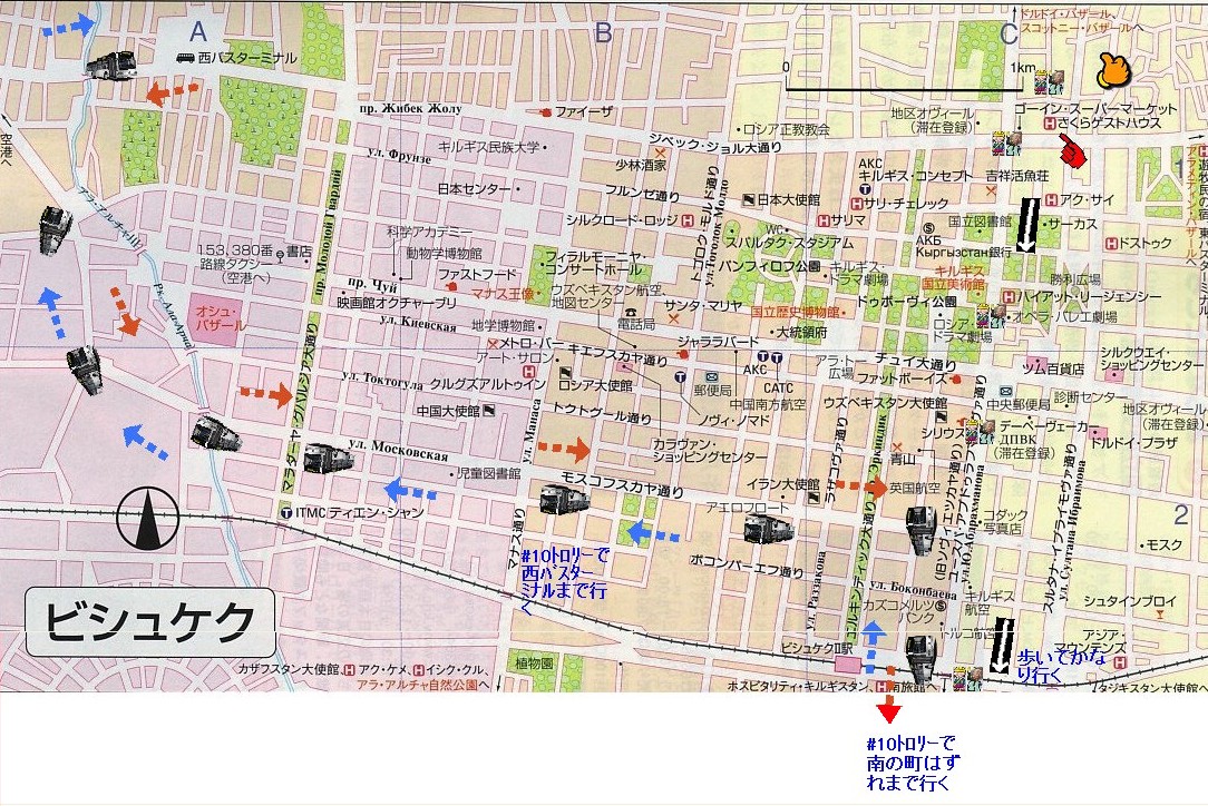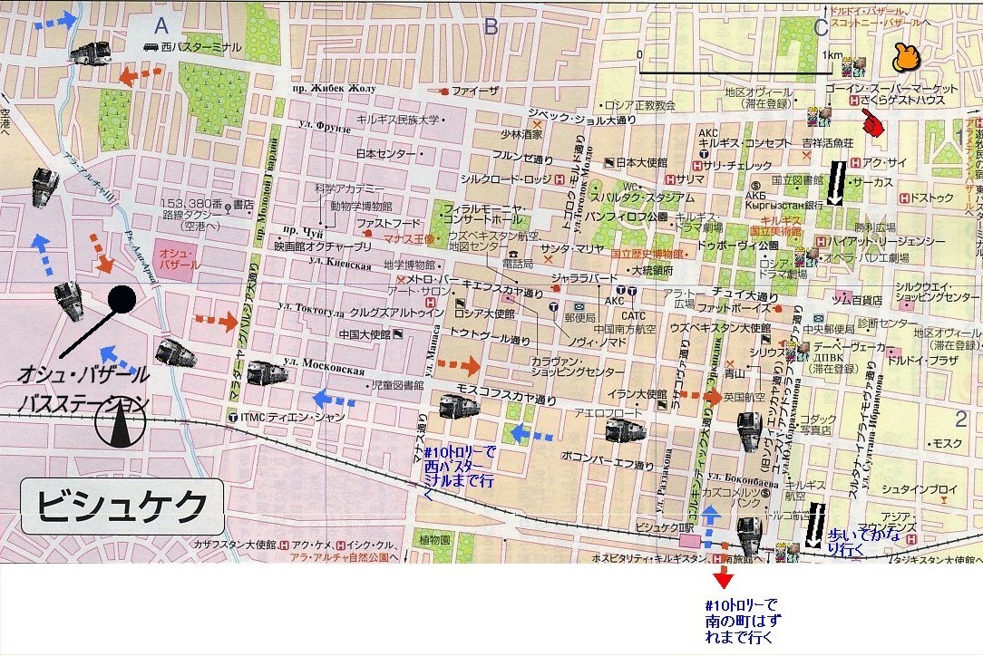 - オシュ・バザールから遠くへ帰るときに市内バスやトロリーバスに乗る場合、非常に便利。マルシュルートカ各種もタムロしている。