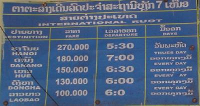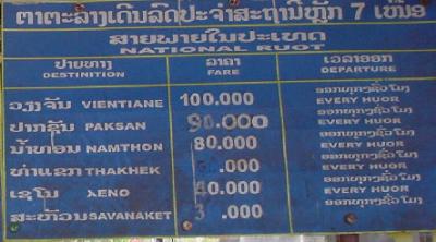 パクセーより北方面行きのバスが発着する、パクセー・北バスターミナルの時刻・運賃表