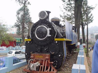ニルギル山岳鉄道のクーヌール駅前には87年前建造の蒸気機関車ミニトレインSLが展示されている。